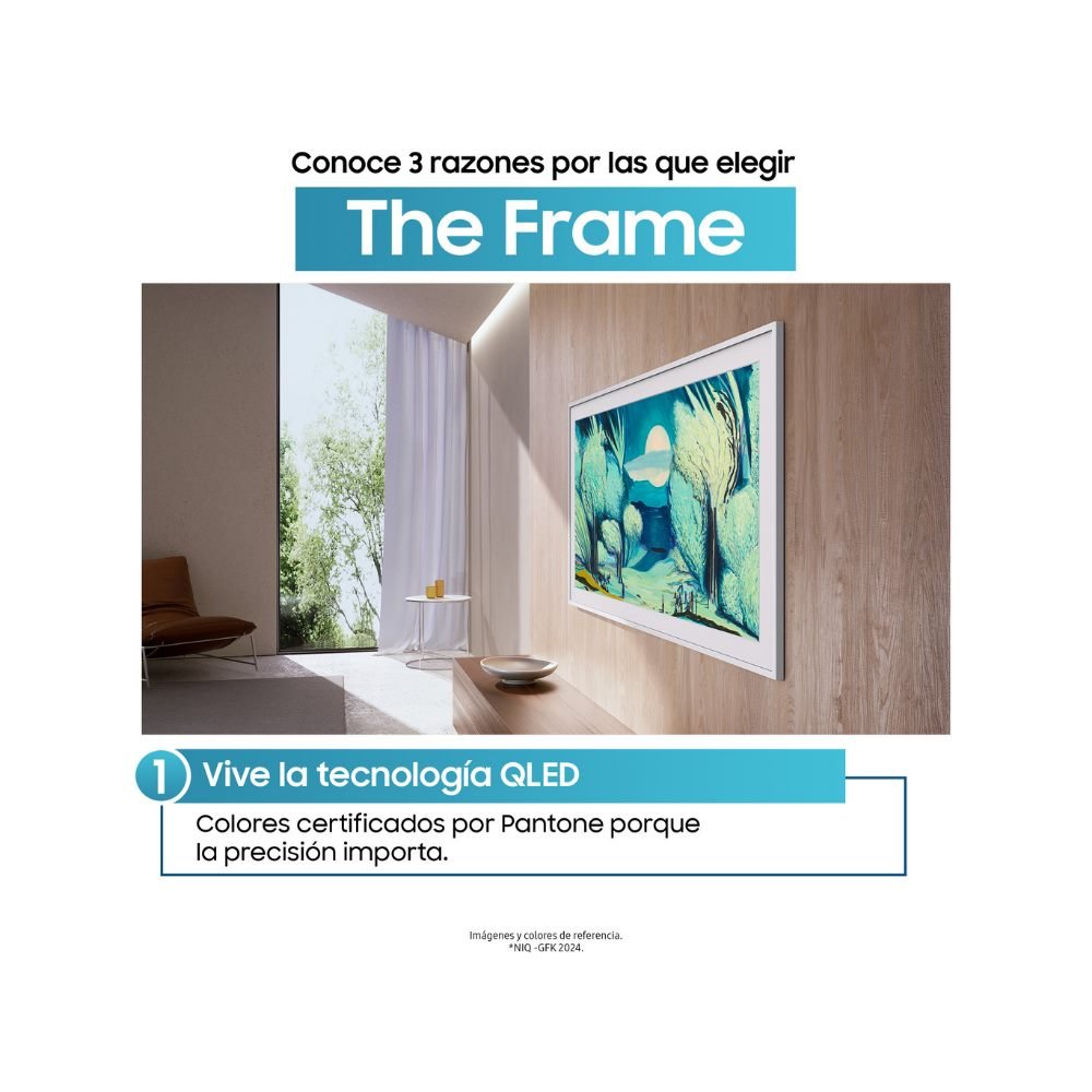 Description: Televisor Samsung THE FRAME QLED Smart TV 55 pulgadas, UHD 4K /3,840 x 2,160 / DVB-T2 / Wifi 5/ Modo Arte/ NQ4 AI Gen 2 procesador/ 144Hz/ Pantalla Mate /Bluetooth 5.3/ Dual Led / asistente de voz / Multiview/ modo ambiente/ Modo Juego/ HDMI x 4 / USB x 2 /LAN/ One conect /40W audio/ abre y edita archivos de Office/ Control Solar/Garantía 1 añ