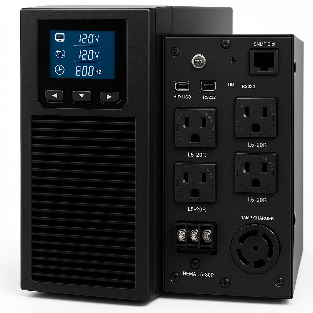 3KVA /2,7KW torre UPS con 6 bat 12v9AH,120V 60HZ + 4 tomas L5-20RV+ BORNERA. LCD; HID USB, EPO, SNMP slot , RS232. Cargador 1AMP. Toma de entrada NEMA L5-30P.